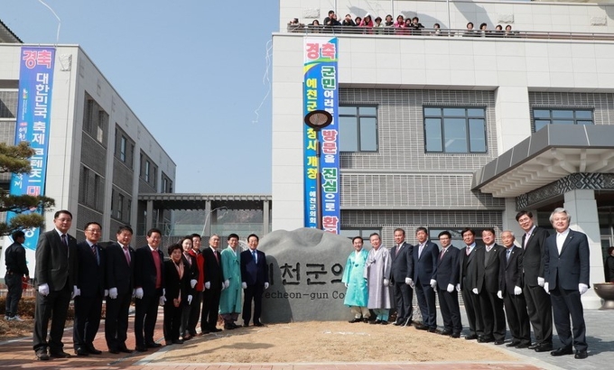 군은 지난81년도에 건립돼 사용해 오던 구청사가 낡고 면적이 협소하다는 이유로 4만1,893㎡의 부지에 1만7,617㎡(지하1층, 지상5층)의 신청사를 건립해 12일 오후1시 도지사와 지역 국회의원을 비롯해 관내 도·군 의원, 주민 등이 참가한 가운데 개청 식을 가졌다.
