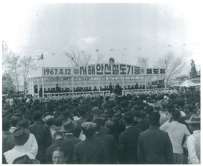 서해안선 철도 기공식에 정일권 국무총리가 축사를 하고 있다 (67. 4. 12)
