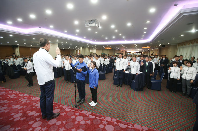 구미시체육회가 ‘제57회 경북도민체육대회 구미시선수단 필승 결의대회와 결단식’을 가졌다. 9일 오후 구미웨딩홀에서 열린 이 자리에는 체육회임원과 선수들을 비롯해 국회의원과 도·시의원, 기관단체장, 서포터즈, 학교장 등 400여명이 한자리에 모였다.