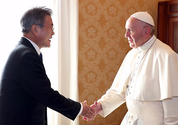 청와대에 따르면, 교황청을 공식방문 중인 문재인 대통령은 10월 18일(현지시간) 교황궁에서 프란치스코 교황을 예방했다. 오후 12시 5분부터 45분까지 단독 면담이 진행됐고, 이후 10여분 동안 선물교환 및 기념사진을 촬영했다. 프란치스코 교황이 “만나 뵙게 돼서 반갑다”고 말했고 문 대통령도 “만나 뵙게 돼서 반갑다”고 인사했다. 문 대통령은 “저는 대통령으로서 교황청을 방문했지만 ‘디모테오’라는 세례명을 가진 가톨릭 신자이기도 하다”면서 “‘주교시노드’(세계 주교대의원회의) 기간 중에도 시간을 내주셔서 감사드린다”고 전했다. 그러면서 “어제 한반도 평화를 위한 미사를 하게 해 주셔서 배려에 감사드린다”고 사의를 표했다. 면담은 통역만 배석한 채 진행됐다. 통역은 교황청 인류복음화성에 파견돼 근무하고 있는 대전교구 소속 한현택 신부가 맡아 진행했다. 문 대통령은 “교황께서 바쁜 일정 가운데서도 따뜻하게 맞아 주시고 한반도의 평화와 화합, 공동번영을 위해 늘 기도하며 한반도 정세의 주요 계기마다 축복과 지지의 메시지를 보내 주신데 대해 감사드린다”고 밝혔다. 이어 문 대통령 “지난달 평양을 방문했을 때 김정은 위원장에게 교황께서 한반도 평화와