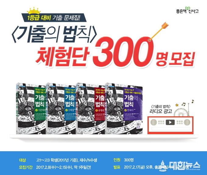 좋은책신사고(대표이사 홍범준)가 수능 기출문제집 '기출의 법칙' 학생 체험단 300명을 오는 15일까지 모집한다. 기출의 법칙 체험단은 고등학생 1학년부터 재수생까지 누구나 신청 가능하다. 체험단 모집 소식을 블로그, 카페 등 SNS에 스크랩한 후 좋은책신사고 홈페이지에서 간단한 신청서를 작성해 제출하면 된다. 체험단 학생들에게는 기출의 법칙 교재와 1등급 수능 기법을 담은 기법 노트, 카카오프렌즈와 협업해 제작한 2017 신사고 스터디 플래너로 구성된 '기출 열공세트'를 증정한다.