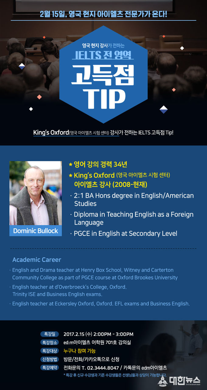 이번 특강은 edm아이엘츠 수강생을 비롯해 누구나 수강할 수 있으며 선착순 80명 모집한다. 참가 신청은 카카오톡(edm아이엘츠) 및 전화(02-3444-8047)로 하면 된다. 한편 edm아이엘츠는 본원 수강생뿐 아니라, 일반 학생들에게도 매달 무료 특강을 오픈하고 있다. 스피킹, 라이팅 등 아이엘츠 파트 별로 고득점을 위한 핵심 강좌들로 엄선해 특강마다 빠르게 마감될 정도로 큰 인기를 끌고 있다. 자세한 내용은 edm아이엘츠 홈페이지에서 확인할 수 있다.
