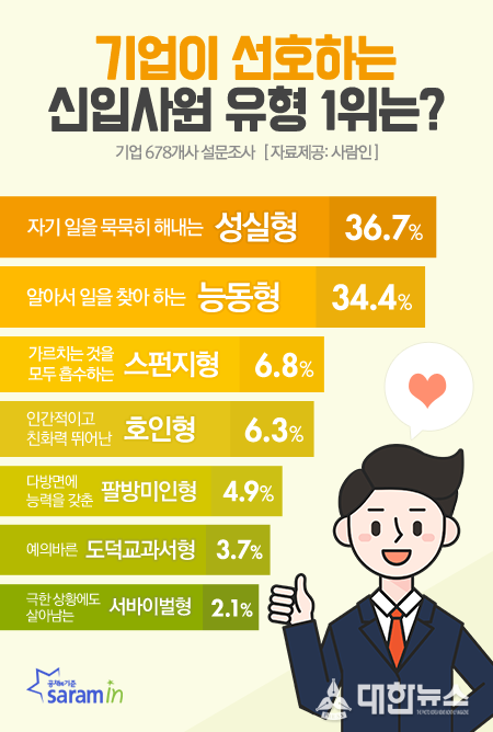 취업포털 사람인(대표 이정근)이 기업 678개사를 대상으로 ‘가장 선호하는 신입사원 유형’에 대해 조사한 결과, ▲ 자기 일을 묵묵히 해내는 ‘성실형’(36.7%)이 1위를 차지했다. 다음으로 ▲ 알아서 일을 찾아 하는 ‘능동형’(34.4%), ▲ 가르치는 것은 모두 흡수하는 ‘스펀지형’(6.8%), ▲ 인간적이고 친화력이 뛰어난 ‘호인형’(6.3%), ▲ 다양한 능력을 갖춘 ‘팔방미인형’(4.9%), ▲ 인사성 좋고 예의 바른 ‘도덕교과서형’(3.7%), ▲ 극한 환경에서도 살아남는 ‘서바이벌형’(2.1%) 등의 순이었다.