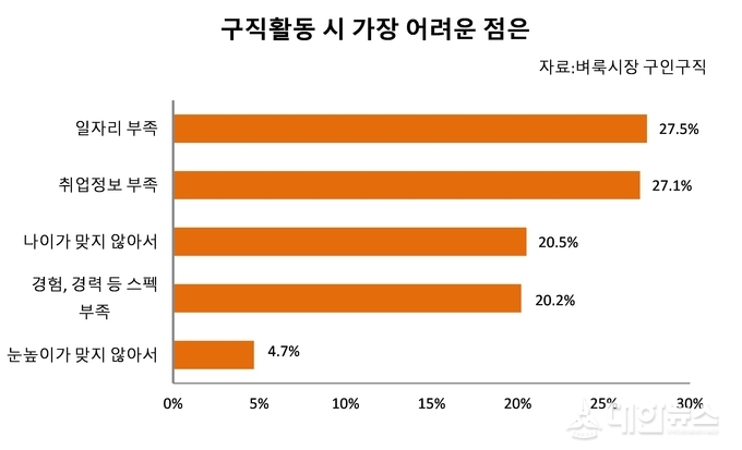 벼룩시장구인구직(대표 최인녕)이 중장년층 774명을 대상으로 실시한 ‘중장년 취업의식조사’에 따르면 구직 시 가장 어려운 점으로 ‘일자리 부족’(27.5%)과 ‘취업정보 부족(27.1%)을 가장 많이 꼽았다. ‘경험, 경력 등 스펙 부족’(20.2%), ‘나이가 맞지 않아서’(20.5%), ‘눈높이가 맞지 않아서’(4.7%) 등이 그 뒤를 이었다.
