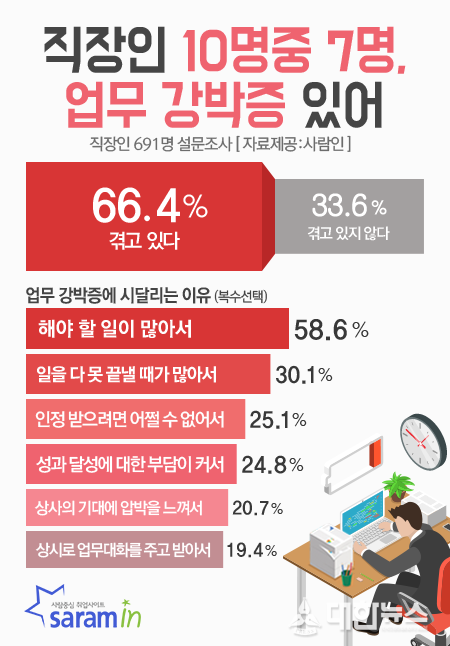 취업포털 사람인(대표 이정근)이 직장인 691명을 대상으로 ‘업무 강박증’을 주제로 조사한 결과, 66.4%가 근무시간 외에도 업무 고민 및 압박감에 시달리는 강박증을 겪고 있다고 밝혔다. ‘과장급’이 83.2%로 가장 높았고, 이어 ‘대리급’(66.9%), ‘부장급 이상’(65%), ‘사원급’(61.7%) 순이었다.