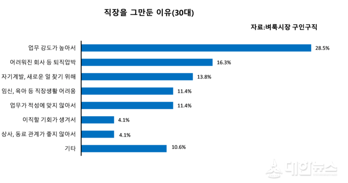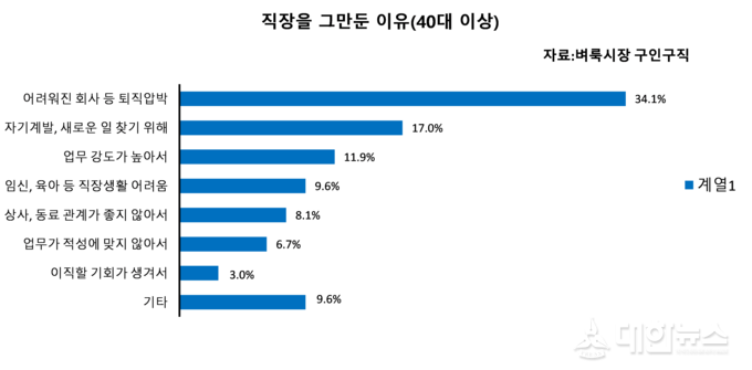 벼룩시장구인구직(대표 최인녕)이 30대 369명, 40대 이상 405명 등 총 774명을 대상으로 실시한 ‘취업의식조사’에 따르면 직장을 그만둔 이유로 30대는 ‘높은 업무 강도’(28.5%)를 꼽았다. 그 뒤를 ‘회사 상황 등 퇴직압박’(16.3%), ‘임신, 육아 등으로 인한 직장생활의 어려움’(11.4%), ‘자기계발 등 새로운 일 찾기’(13.8%), ‘업무가 적성에 맞지 않아서’(11.4%) 등의 순이다. 반면 40대 이상은 ‘어려워진 회사 상황 등 퇴직압박’(34.1%)을 퇴직 이유로 꼽았다. ‘자기계발 등 새로운 일 찾기’(17.0%), ‘높은 업무 강도’(11.9%) 등이 뒤를 이었다.