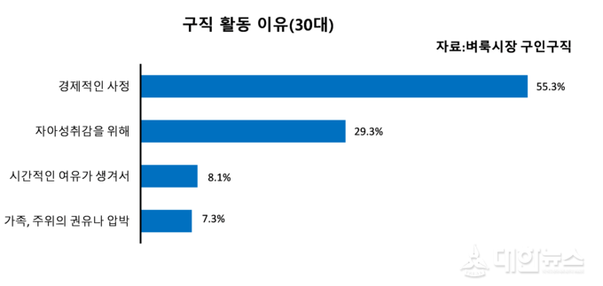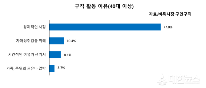 벼룩시장구인구직(대표 최인녕)이 남녀 구직자 774명을 대상으로 실시한 ‘취업의식조사’에 따르면 구직활동의 이유로 67.1%가 ‘경제적 사정’을 꼽았다. 특히 교육비 등으로 지출이 많은 40대 이상의 경우 77.8%나 됐다. 반면 자아 성취감(10.4%)이나 시간적인 여유(8.1%) 등은 저조했다. 30대도 구직활동 이유로 ‘경제적인 사정’(55.3%)을 가장 많이 꼽았지만 ‘자아성취감’도 29.3%나 돼 40대 이상과 차이를 보였다.