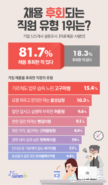 사람인(대표 이정근)이 기업 525개사를 대상으로 ‘채용을 후회한 직원 여부’를 조사한 결과 81.7%가 ‘있다’라고 답했으며, 채용을 후회한 직원 유형 1위는 ‘가르쳐도 업무 습득이 느린 ▲ 고구마형’(15.4%)이 차지했다. 다음으로 ‘불성실형’(10.3%), ‘허풍형’(9.6%), ‘뺀질이형’(9.1%), ‘근태불량형’(8.9%), ‘헛똑똑이형’(7.9%), ‘싸가지형’(7.7%), ‘트러블메이커형’(6.8%) 등이 있었다.