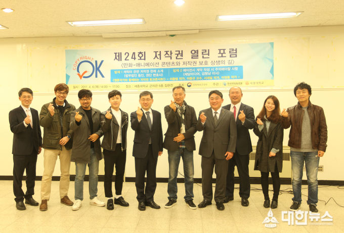 이번 포럼은 세종대학교에서 “만화・애니메이션 콘텐츠와 저작권 보호 상생의 길”이라는 주제로 열렸다. 캐릭터 분야 전문가인 권단 변호사와 만화콘텐츠 에이전시 재담미디어의 김형남 이사가 각각 발제를 했고, 웹툰 작가와 함께 하는 저작권 토크콘서트 시간으로 이어졌다.