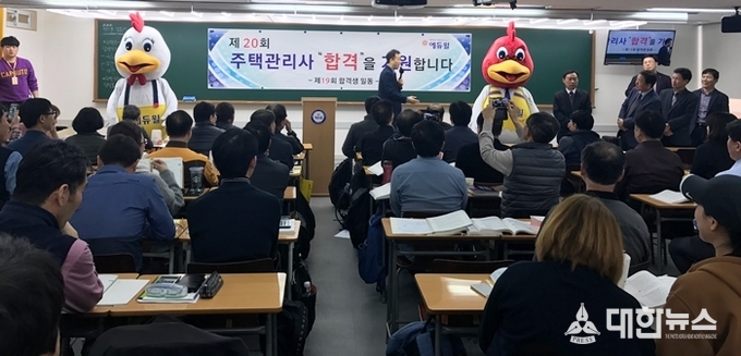 ㈜에듀윌(대표 정학동)은 ‘에듀윌 대방학원’에서 지난 4월 6일(목) ‘주택관리사 시험 D-100 합격기원 이벤트’를 실시했다. 이 행사는 주택관리사 시험을 약 100일 앞두고 수험생들에게 응원의 메시지를 전달하기 위해 마련된 것이다. 이벤트에는 ‘합격이닭’과 ‘열공이닭’ 캐릭터 인형이 등장하고, 팝콘 기계도 동원됐다.