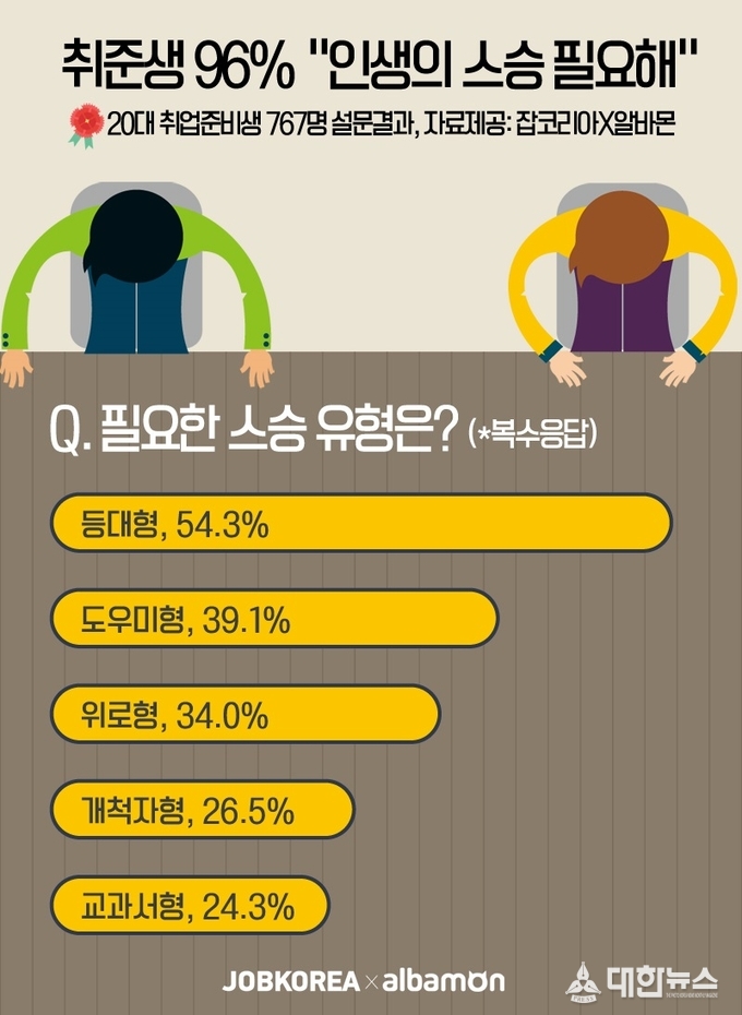 취업포털 잡코리아(대표 윤병준)가 알바몬과 함께 20대 취준생 767명을 대상으로 설문조사를 실시한 결과, 취준생 96.0%는 인생의 스승이 필요하다고 답했다.