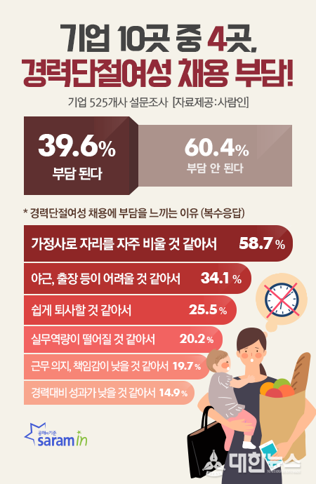 '중견기업'(50%), '중소기업'(38.9%), '대기업'(35.3%) 순으로 부담을 느끼는 비율이 높았다. 경력단절여성 채용에 부담을 느끼는 이유는 '가정사로 자리를 자주 비울 것 같아서'(58.7%, 복수응답)가 가장 많았다. 이어 '야근, 출장 등이 어려울 것 같아서'(34.1%), '쉽게 퇴사할 것 같아서'(25.5%), '실무역량이 떨어질 것 같아서'(20.2%), '근무 의지, 책임감이 낮을 것 같아서'(19.7%), '보유 경력대비 성과가 낮을 것 같아서'(14.9%) 등을 꼽았다.