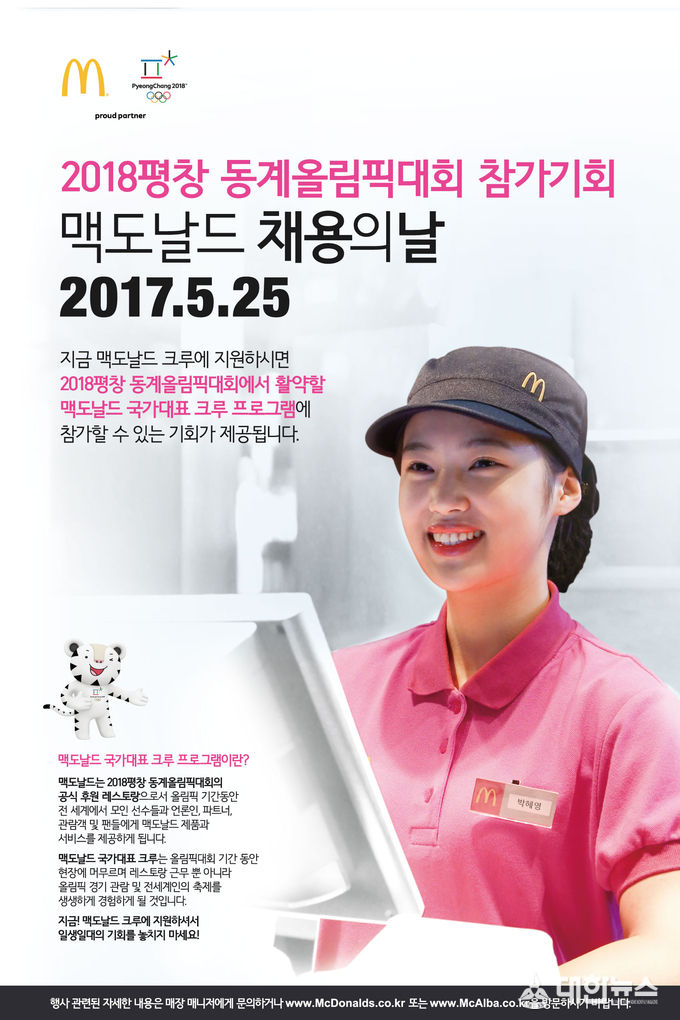 이번 행사로 채용되는 신규 크루에게는 2018평창 동계올림픽대회 기간 중 선수촌 내 맥도날드 레스토랑에서 근무하며 ‘맥도날드 국가대표 크루’로 활약할 수 있는 선발전 참여 기회가 주어진다. ‘맥도날드 국가대표 크루’는 ‘피플 캠페인’ 중 크루 리워드 프로그램의 일환으로, 전국 각지에 근무하는 매장 직원들에게 2018평창 동계올림픽대회 경기 관람 기회와 글로벌 경험을 선사하고자 기획됐다.