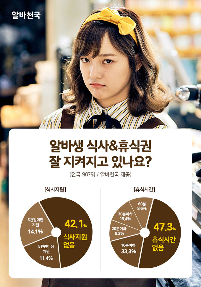 또한, 전체 응답자의 42%는 식사시간조차 갖지 못했으며 상당수의 알바생들이 근무 중 주어지는 식사시간에 대해 ‘5분 (5.8%)’, ‘10분 (7.4%)’, ‘20분 (13%)’이라고 답했다. 식사할 때 주로 무엇을 하느냐는 질문에는 ‘밥만 먹는다’가 35.7%로 1위를 차지했으며, 2위는 ‘함께 먹는 사람과 대화한다’(26%), 3위는 ‘SNS를 한다’(14.6%), 4위는 ‘일을 하며 먹는다’(11.5%)로 나타났다.