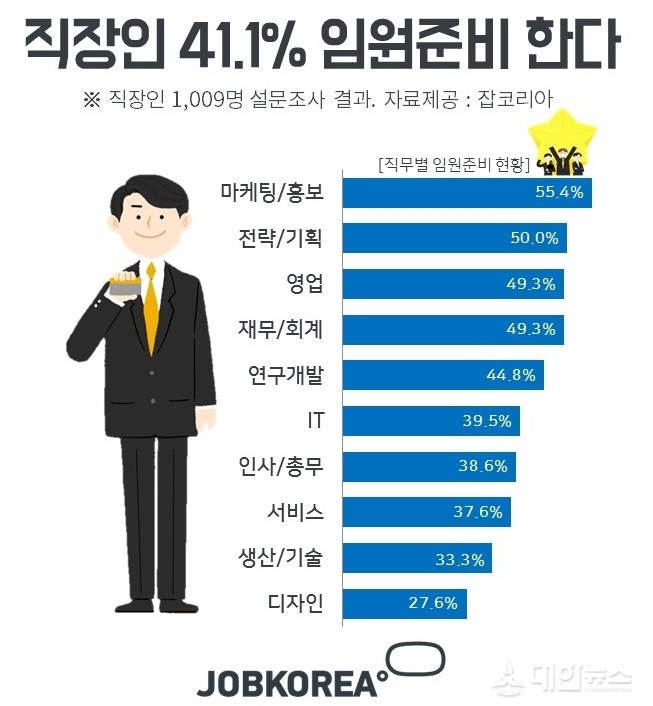 취업포털 잡코리아(대표이사 윤병준) 남녀 직장인 1,009명을 대상으로 설문조사를 진행한 결과, 현재 임원(경영진)이 되기 위해 준비하고 있는 직장인은 41.1%로 10명중 4명 정도에 그쳤다.