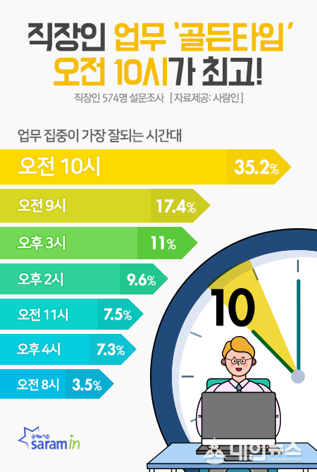 사람인(대표 이정근)이 직장인 574명을 대상으로 ‘업무 집중도’에 대해 조사한 결과 35.2%가 ‘오전 10시’를 가장 집중도가 높은 시간으로 꼽았다. 두 번째로는 ‘오전 9시’(17.4%)라고 답해, 절반 이상의 직장인이 출근 직후 2시간동안 가장 집중도가 높은 것으로 보여졌다. 다음으로는 ‘오후 3시’(11%), ‘오후 2시’(9.6%), ‘오전 11시’(7.5%) 등의 답변이 이어졌다.
