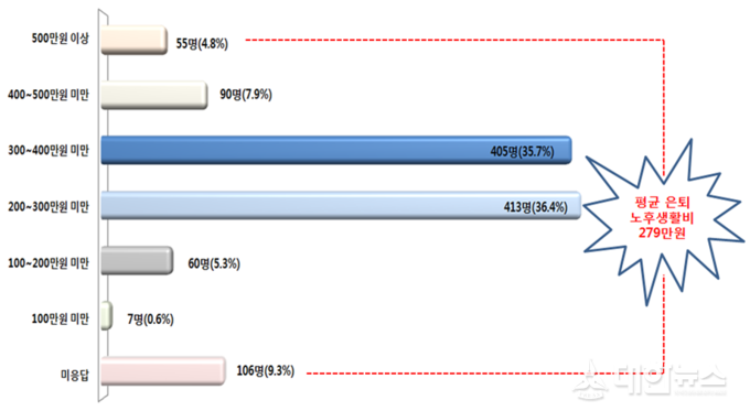 가장 먼저 은퇴 이후 필요한 노후생활비는 월 279만원으로 집계됐다. 이는 응답자 평균 최종 연봉액인 6,490만원(월 540만원)의 약 절반수준이다. 이어 “200만원 이상~300만원 미만(36.4%)”, “300만원 이상~ 400만원 미만(35.7%)” 순으로 응답자의 비율이 높았다.