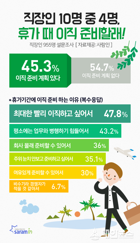 사람인(대표 이정근)이 직장인 955명을 대상으로 ‘휴가기간 중 이직 준비 계획’에 대해 조사한 결과, 45.3%가 휴가기간에 이직을 준비할 계획인 것으로 나타났다. 휴가기간에 이직을 준비하는 이유는 ‘최대한 빨리 이직하고 싶어서’(47.8%, 복수응답)가 단연 높았다. 이어 ‘평소에는 업무와 병행하기 힘들어서’(43.2%), ‘회사 몰래 준비할 수 있어서’(36%), ‘주위 눈치 안 보고 준비하고 싶어서’(35.1%), ‘여유 있게 준비할 수 있어서’(30%) 등이 있었다.