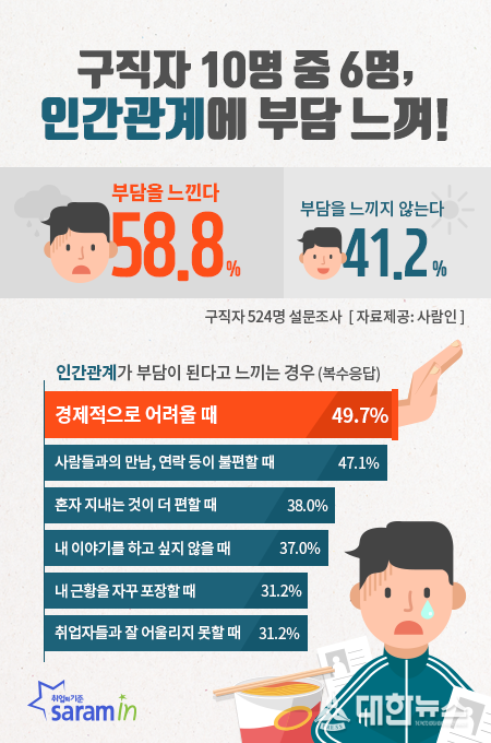 인간관계가 부담이 된다고 느끼는 경우는 ‘경제적으로 어려울 때’(49.7%, 복수응답)가 1위를 차지했다. 다음으로 ‘사람들과의 만남, 연락 등이 불편할 때’(47.1%), ‘혼자 지내는 것이 더 편할 때‘(38%), ‘내 이야기를 하고 싶지 않을 때’(37%), ‘내 근황을 자꾸 포장해서 이야기할 때’(31.2%), ‘취업자들과 잘 어울리지 못할 때’(31.2%) 등이었다. 부담감을 느끼는 빈도는 ‘가끔 느낀다’고 응답한 사람이 53.6%로 가장 많았으며, ‘항상 느낀다’는 응답도 46.4%였다. 또, 부담감으로 인해 인간관계가 좁아진다고 생각하는 구직자는 81.5%에 달했다.