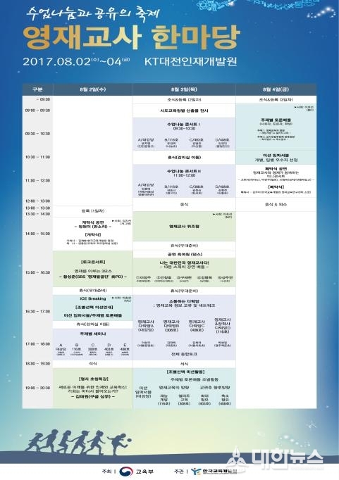 한국교육개발원(원장 김재춘)과 교육부(부총리 겸 교육부장관 김상곤)는 오는 8월 2일(수)부터 4일(금)까지 2박 3일 간 KT 대전인재개발원에서 제1회 영재교사 한마당을 개최한다. 이번 행사는 '수업 나눔과 공유의 축제, 영재교사 한마당!'이라는 주제로 전국 영재교육 담당교사 및 관계자 등 400여명을 대상으로 처음 실시되는 연수이다.