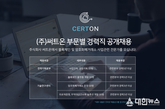 써트온은 이 분야의 경력직원을 채용하고 있다. 모집분야로는 r암호화폐거래소 시스템운영 및 CS운영부문, r웹/모바일 프론트 및 백앤드 서버 개발, r 블록체인플랫폼 코어 설계 및 개발 등이다. 채용 관련 자세한 사항은 각 채용공고 사이트에서 확인 가능하다.