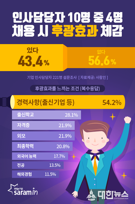 사람인(대표 이정근)이 기업 인사담당자 221명을 대상으로 ‘채용 시 후광효과 체감 경험’에 대해 조사한 결과, 43.4%가 ‘체감한다’라고 답했다. 후광효과는 지원자의 ‘경력사항(출신기업 등)’(54.2%)에서 가장 많이 느낀다고 답했다. 계속해서 ‘출신학교’(28.1%), ‘자격증’(21.9%), ‘외모’(21.9%), ‘최종학력’(20.8%), ‘외국어 능력’(17.7%), ‘전공’(13.5%), ‘해외경험’(11.5%), ‘취미 및 특기’(9.4%), ‘나이’(9.4%), ‘부모의 배경’(7.3%), ‘학점’(6.3%), ‘결혼여부’(5.2%) 등의 순서로 답변했다.