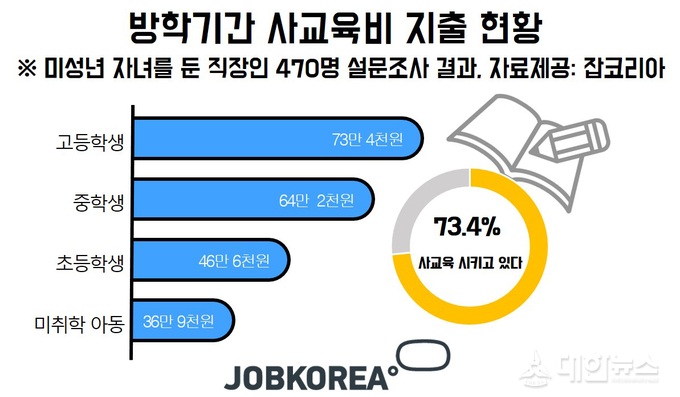 취업포털 잡코리아(대표이사 윤병준)가 미성년 자녀를 둔 직장인 470명을 대상으로 방학기간 자녀 사교육 현황을 주제로 설문조사를 실시한 결과, 73.4%의 미취학 아동 및 초,중,고 학생이 사교육을 받고 있으며 이들이 받고 있는 사교육의 개수는 평균 2.3개로 나타났다.