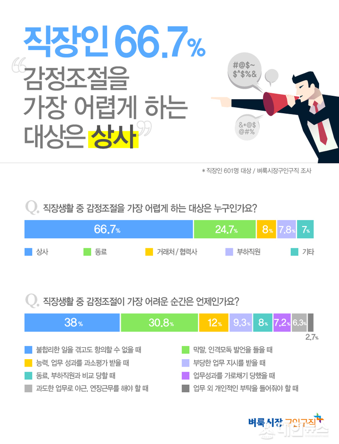 벼룩시장구인구직(대표 최인녕)이 직장인 601명을 대상으로 설문조사를 실시한 결과, 직장인 10명 중 7명은 감정조절을 어렵게 하는 대상으로 ‘상사’를 꼽았다.