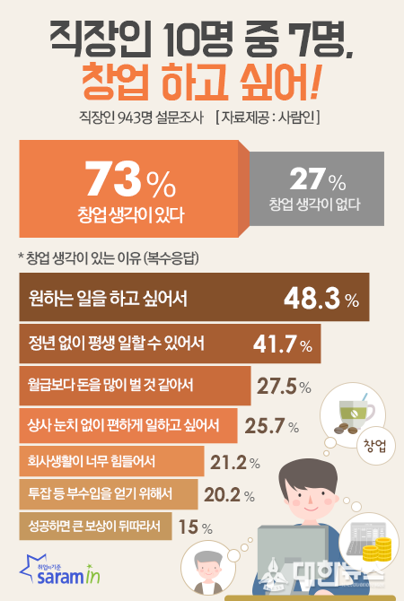 사람인(대표 이정근)이 직장인 943명을 대상으로 ‘창업의향’에 대해 조사한 결과, 73%가 ‘창업 의향이 있다’고 답했다. 직급별로 살펴보면 '임원급'(83.8%)이 가장 많았으며, '대리급'(79.2%), '부장급'(77.3%), '과장급'(74.3%), '사원급'(67.6%)의 순이었다.