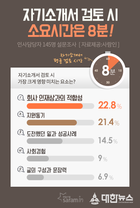 자기소개서 검토 시 가장 크게 영향을 미치는 요소는 ‘회사 인재상과의 적합성’(22.8%)을 1순위로 꼽았다. 다음으로 ‘지원동기’(21.4%)가 바로 뒤를 이었고, ‘도전했던 일과 성공사례’(14.5%), ‘사회경험’(9%), ‘글의 구성과 문장력’(6.9%), ‘성격의 장단점’(6.9%), ‘맞춤법 및 오타자’(6.2%), ‘실패사례와 극복방법’(4.1%), ‘입사 후 포부’(4.1%) 등이 있었다.