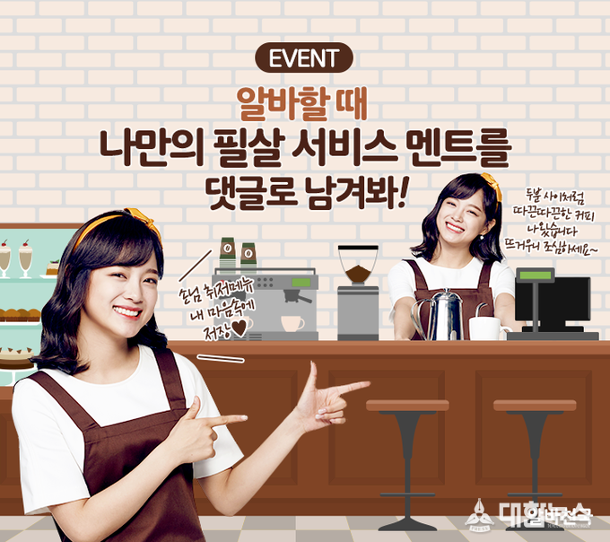 알바천국(대표 최인녕)이 ‘나만의 필살 서비스 멘트 이벤트’를 진행 중이다. 손님의 기분을 좋게 하는 본인만의 멘트를 알바천국 공식 페이스북 이벤트 페이지에 댓글로 달면 자동 응모 된다. 댓글 작성 시 친구를 태그할 경우 당첨 확률이 더욱 높아진다.