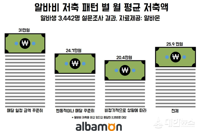 알바생의 월 평균 저축액은 25만 9천원으로 조사됐으며 저축 패턴에 따라 저축액에 차이를 보였다. △’매달 일정 금액을 꾸준히 저축했다’고 응답한 알바생의 저축액이 31만원으로 가장 많았다. △’금액은 변동적이나 매달 꾸준히 저축했다’가 24만 7천원, △’비정기적으로 상황에 따라 저축했다’는 20만 4천원으로 나타나 정기적으로 저축할수록 저축액이 높은 것으로 분석됐다.