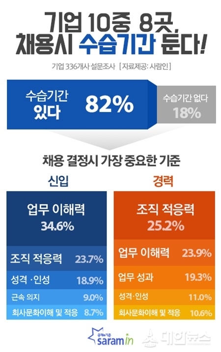 수습기간 후 정식 채용 여부를 결정하는 가장 중요한 기준 중 신입은 ‘업무 이해력’(34.6%)을 1위로 꼽았으며, ‘조직 적응력’(23.7%), ‘성격 및 인성’(18.9%), ‘근속 의지’(9%), ‘회사문화 이해 및 적응’(8.7%), ‘업무 성과’(2.6%) 등의 순이었다. 경력은 ‘조직 적응력’(25.2%)을 가장 우선시하고 있었다. 이어 ‘업무 이해력’(23.9%), ‘업무 성과’(19.3%), ‘성격 및 인성’(11%), ‘회사문화 이해 및 적응’(10.6%), ‘근속 의지’(6%), ‘근태관리’(1.4%) 등의 순으로 답했다.