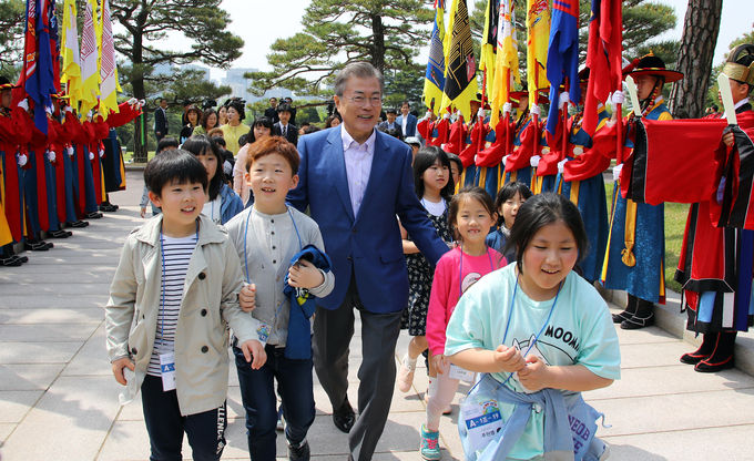 문재인 대통령과 김정숙 여사는 도서·벽지 지역의 어린이 등 280여 명을 청와대로 초대해 녹지원에서 어린이날을 함께 보냈다. 아이들은 전통 의장대의 호위를 받으며 입장했다. 아이들이 정말 좋아하는 ‘상어가족’ 노래가 청와대에 울려퍼졌다.