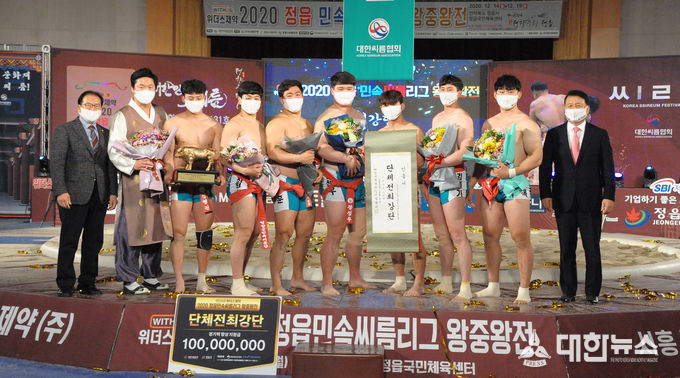 (대한뉴스 박청식기자)=영암군민속씨름단은 지난 14일부터 19일까지 전북 정읍시 정읍국민체육센터에서 열린 “2020 정읍 민속씨름리그 왕중왕전”에서 백두장사와 금강장사 등극, 단체전 우승을 거머쥐면서 올해 마지막 씨름대회를 휩쓸어 씨름 강군으로서 영암군의 명성을 다시 한번 크게 드높였다.