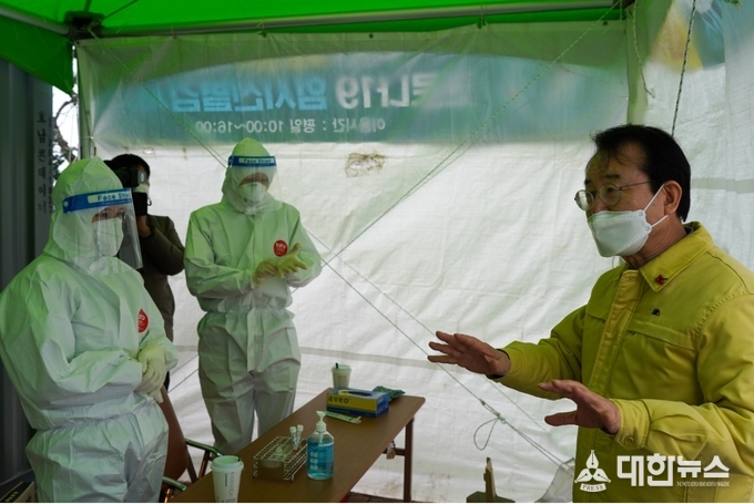 (대한뉴스 박청식기자)=김종식 목포시장이 5일 평화광장에 마련된 코로나19 임시선별검사소를 방문해 운영상황을 점검하고 의료진을 격려했다.