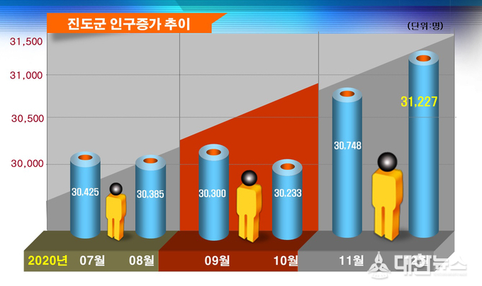 진도군은 지난해 10월 인구가 3만233명으로 3만명이 무너질 위기였지만 올해 1월 초순 3만1,227명을 기록하면서 다시 3만1,000명 선을 회복했다.