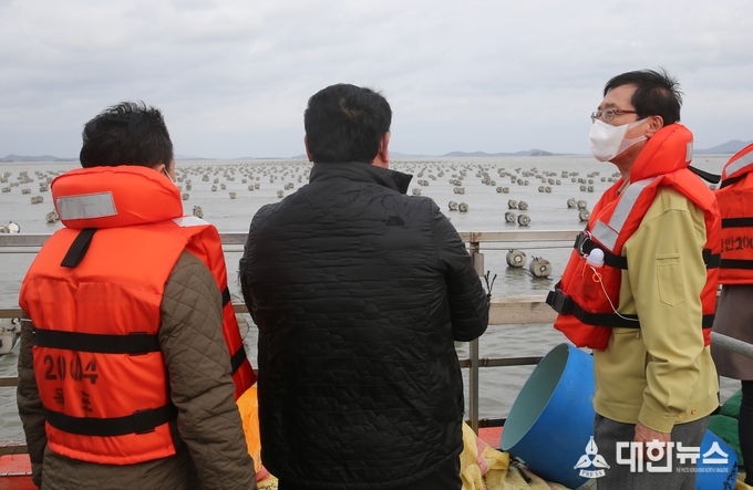 박 차관은 배를 타고 욕지어촌계 김양식장 피해상황 확인과 어업인들을 격려하고 대책 마련을 약속했다.