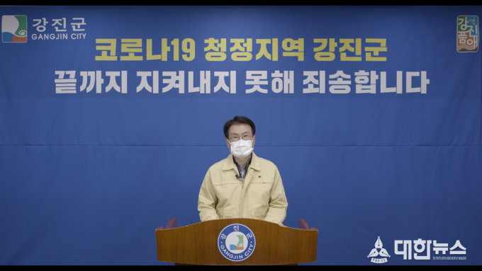 16일 오후 이승옥 강진군수는 군민호소문을 발표하고 “이제까지 군민여러분의 적극적인 협조로 코로나19 확진자가 없었으나 지난 밤에 확진자 3명이 발생하여 안타깝고 군민 여러분께 송구하다.”며, “더 이상 코로나가 확산되지 않도록 마스크 쓰기 생활화, 사회적 거리두기 등 개인 방역수칙을 잘 지켜 주시기 바란다.”고 당부했다.
