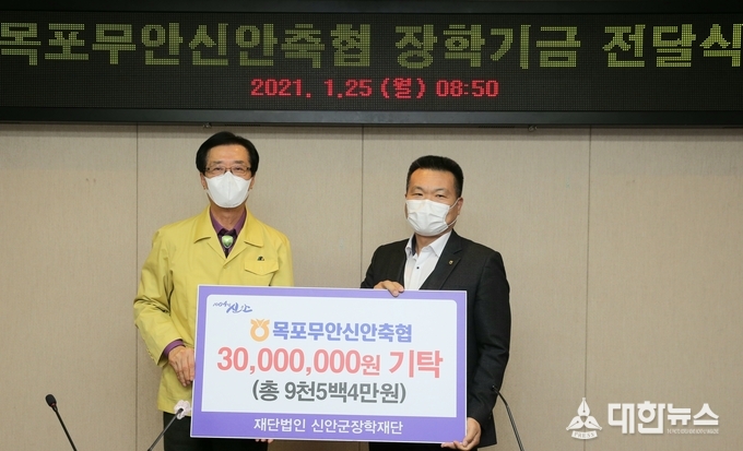 (대한뉴스 박청식기자)=목포무안신안축협 문만식 조합장과 임원들은 25일 신안군청을 방문해 지역인재육성을 위해 사용해 달라며 3천만원의 장학기금을 전달했다.