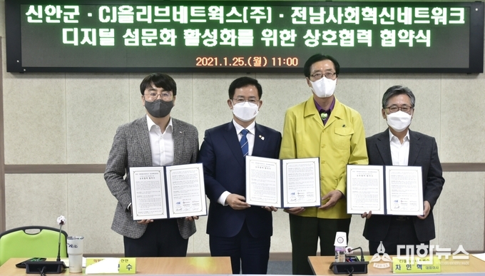 (대한뉴스 박청식기자)=신안군은 2021년 1월 25일 ‘CJ올리브네트웍스’, ‘전남사회혁신네트워크’와 함께 섬이 보유한 자원 및 자산을 수집·활용하여 섬의 가치를 극대화하고 디지털 섬 문화를 향상시키기 위해 다자간 상호협력(MOU)를 체결했다. 신안군청 보건소 대회의실에서 열린 이번 체결식에는 박우량 신안군수, CJ올리브네트웍스 차인혁 대표이사, 전남사회혁신네트워크 정순남 이사장을 비롯한 주요 관계자가 참석했다.