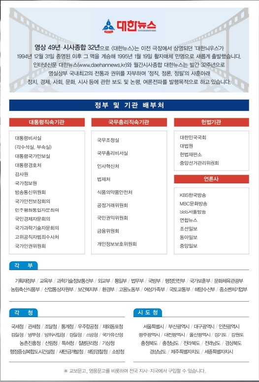 그리고 본지 전국 지사와 대통령실, 정부 각 부처 및 관공서, 군부대, 교육기관, 종교단체, 언론 매체에 고정으로 배포되고 있다.