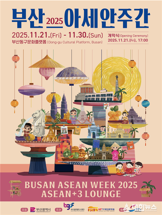 (대한뉴스 윤병하 기자)=부산시(시장 박형준)는 오늘(21일)부터 11월 30일까지 열흘간 동구 문화플랫폼(도시철도 부산진역 8번 출구)에서 「2025 부산-아세안 주간」을 개최한다고 밝혔다.