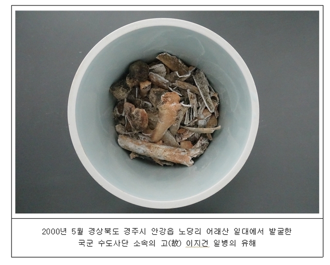 국방부유해발굴감식단(이하 국유단)은 2000년 5월 경상북도 경주시 안강읍 노당리 어래산 일대에서 발굴한 유해의 신원을 국군 수도사단소속의 고 이지건 일병으로 확인했다.