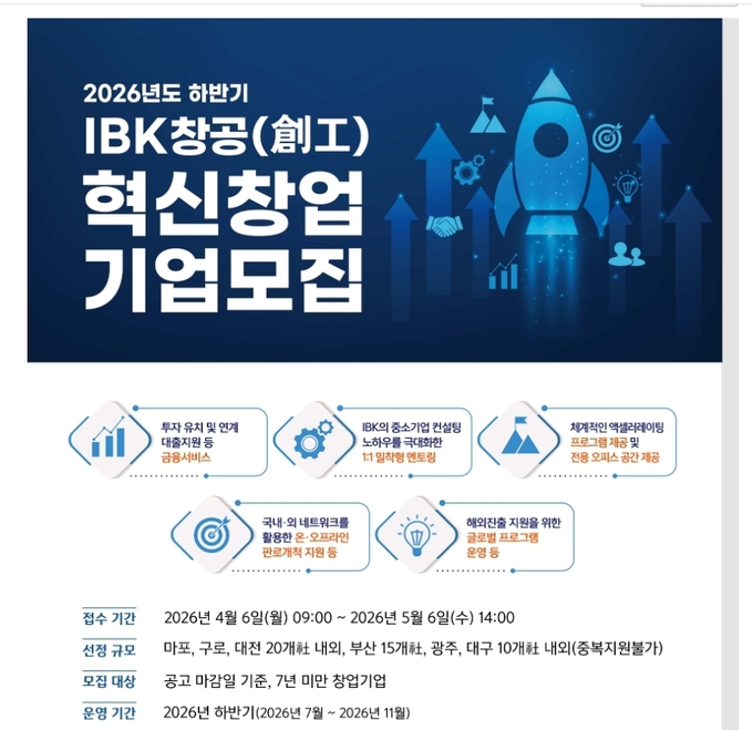 (대한뉴스 한원석 기자)=IBK기업은행(은행장 장민영) 창업육성 플랫폼 ‘IBK창공(創工)’이 지난 6일 ‘2026년 하반기 혁신창업기업 모집’을 시작했다고 밝혔다.