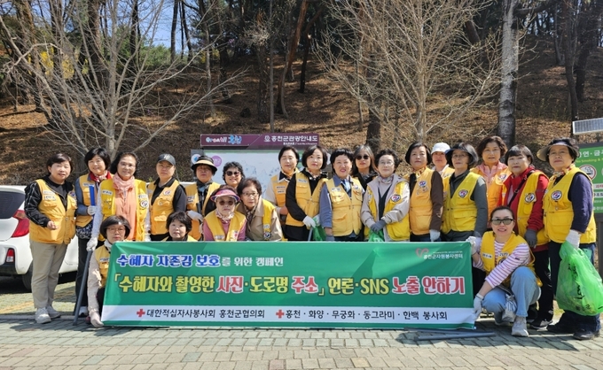 (대한뉴스 한원석 기자)=대한적십자사봉사회 홍천군협의회(회장 김용덕)와 홍천봉사회(회장 안윤노)는 13일 무궁화테마파크에서 복지 수혜자 자존감과 개인정보 보호를 위한 ‘수혜자 사진과 도로명 주소 노출 안하기’ 캠페인과 함께 탄소중립 환경정화 봉사활동을 진행했다.