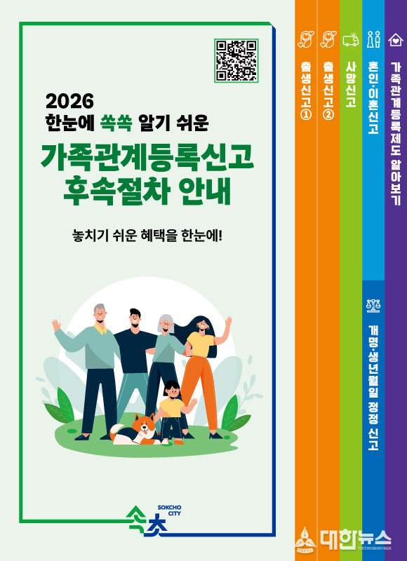 (대한뉴스 김기준 기자_)=) 속초시가 가족관계등록신고 이후 시민들이 이행해야 할 각종 후속 행정절차를 한눈에 확인할 수 있도록 ‘가족관계등록신고 후속절차 안내’ 리플릿을 제작해 배포한다.