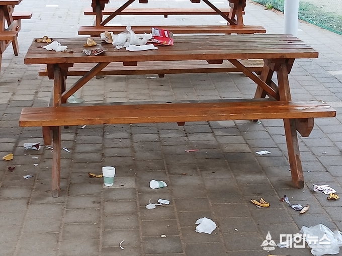 최근 대저파크골프장 내 휴식 공간은 이용객들이 버리고 간 오물로 몸살을 앓고 있다. 벤치 아래에는 피우다 버린 담배꽁초가 수두룩하고, 바닥 곳곳에는 마시다 남은 종이컵과 음식물 포장지가 널브러져 있다.