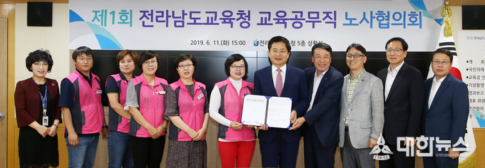 전라남도교육청(교육감 장석웅)이 11일 청사 5층 상황실에서 과반수 노조인 전국학교비정규직노동조합 전남지부와 노사 상생 및 협력의 첫걸음을 위한 제1회 교육공무직 노사협의회를 개최했다.