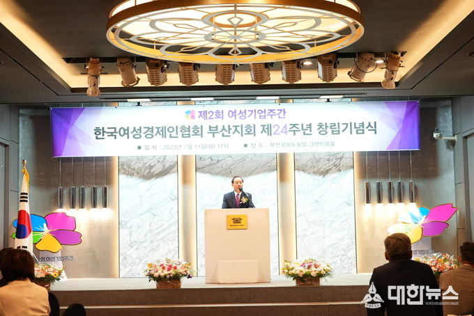 (대한뉴스 윤병하기자)=하윤수 부산광역시교육감이 11일 오후 5시 중구 코모도 호텔에서 박형준 부산시장, 안성민 부산시의회 의장, 김정순 여성경제인협회 부산지회장 등이 참석한 가운데 열린 ‘한국여성경제인협회 부산지회 제24주년 창립기념식’에서 인사말을 하고 있다.